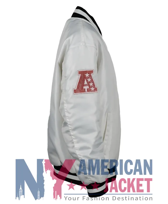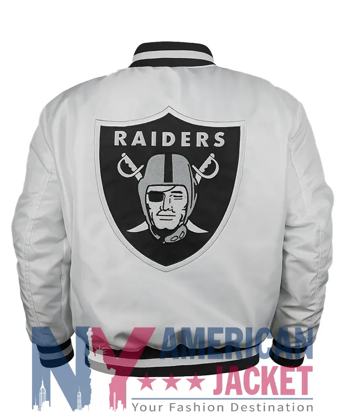 Shop Now American Football Team Mark Davis Las Vegas Raiders White Satin Varsity Jacket For Sale