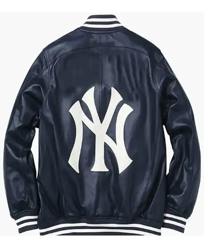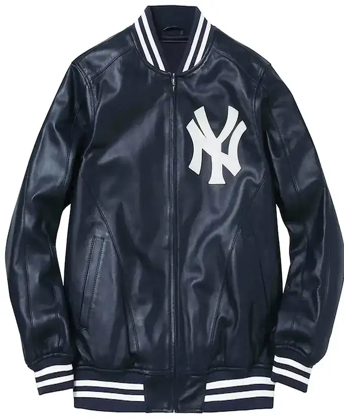 New York Yankees Navy Blue Bomber Leather Jacket For Sale