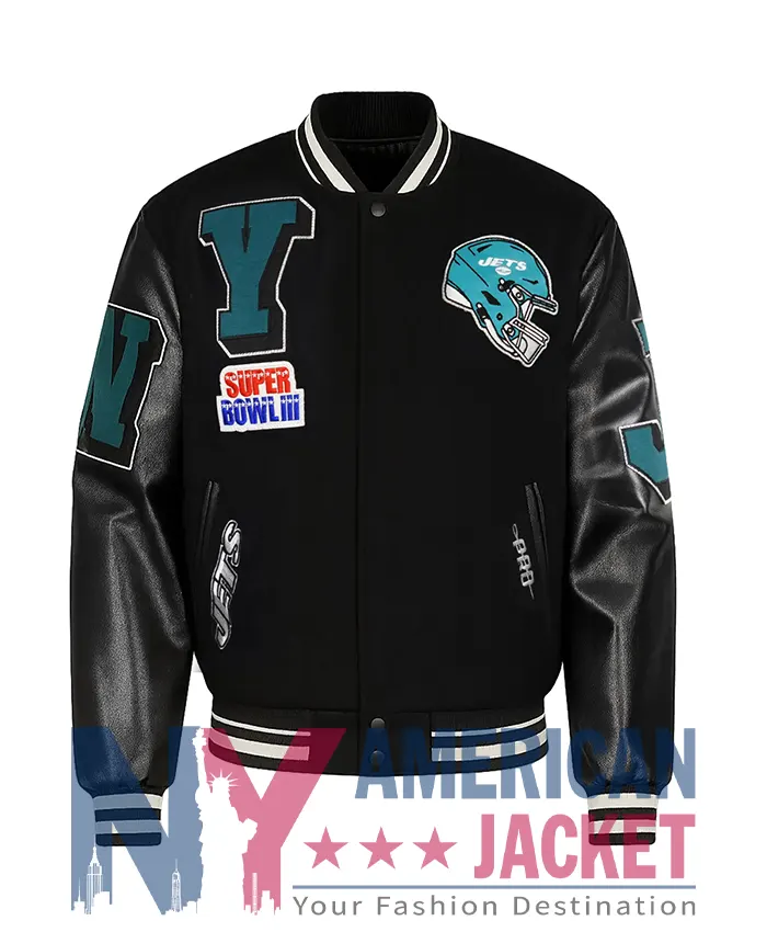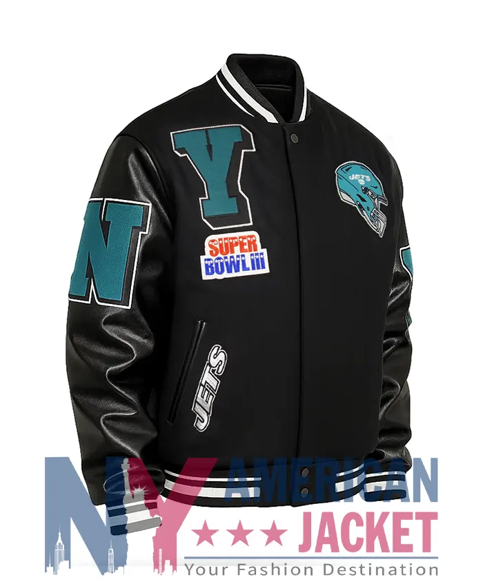 Buy American Football Team New York Jets Mashup Rib Varsity Black Wool Leather Varsity Jacket For Sale