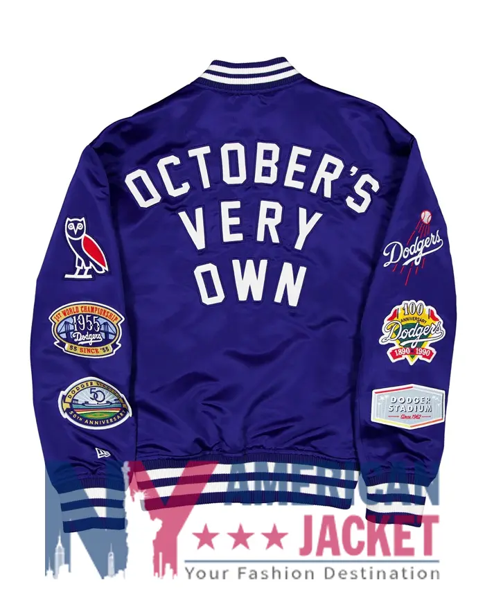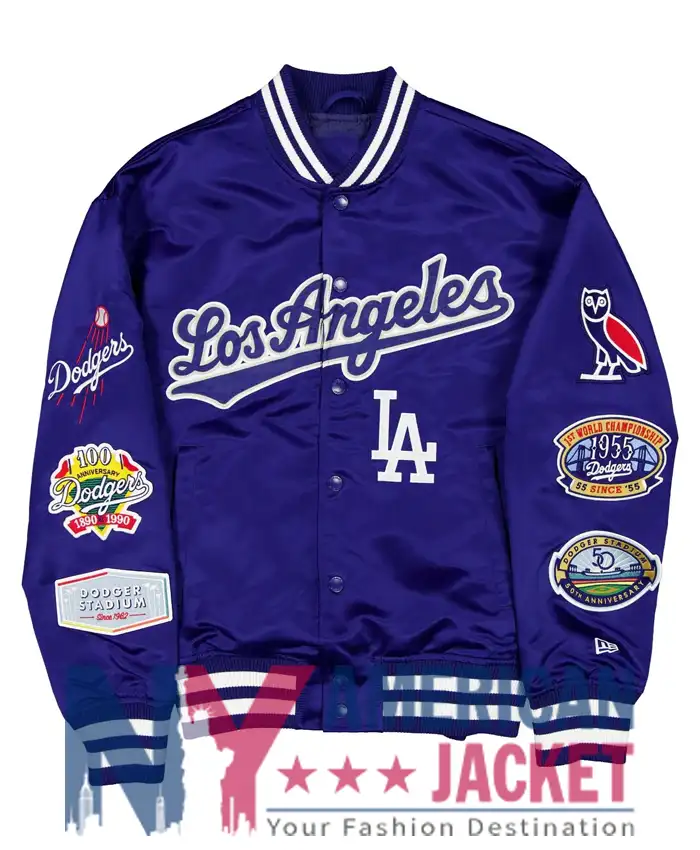 Order Baseball Team OVO x New Era x MLB Dodgers Blue Satin Varsity Jacket Sale