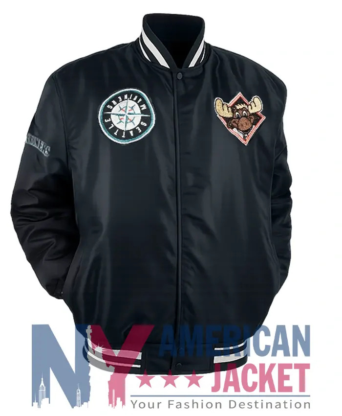 Order Now Baseball Team Seattle Mariners Mariner Moose Navy Blue Satin Varsity Jacket For Sale