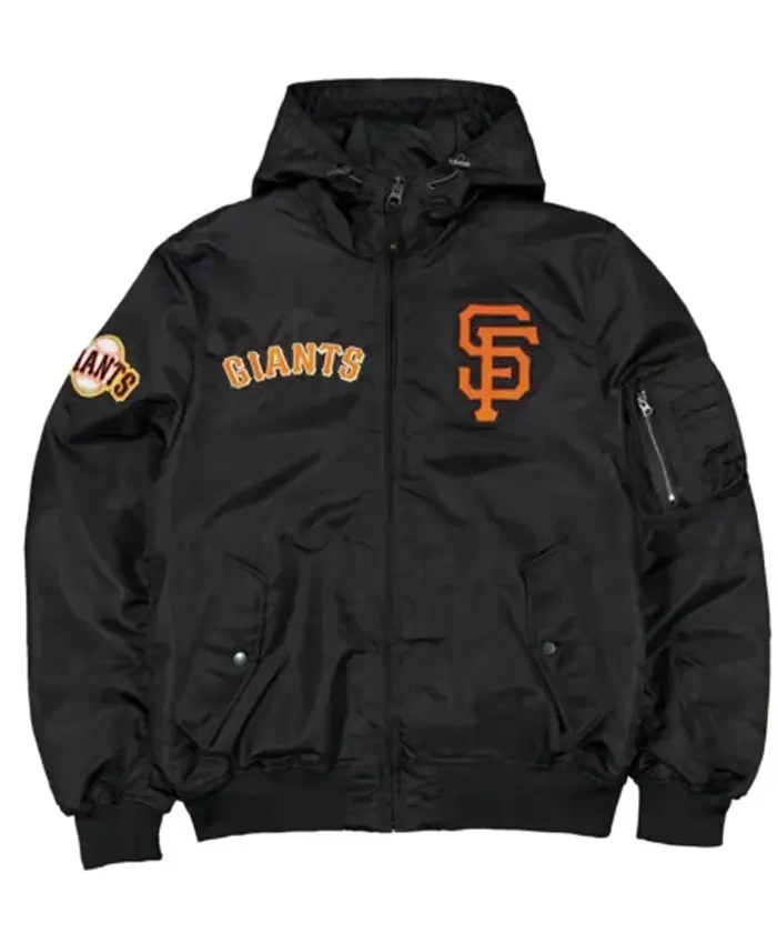 Buy Baseball Team San Francisco Giants Historic L-2B Black Satin Hooded Bomber Jacket For Sale
