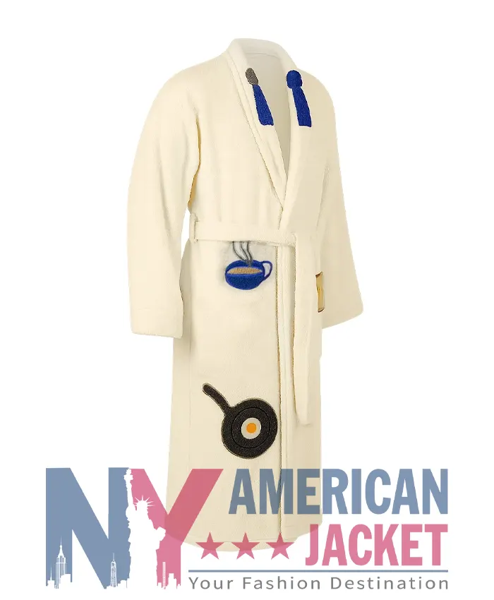 Order Now Unisex Fran Fine TV-Series The Nanny Season 01 Fran Drescher Breakfast OFF-White Robe For Sale. And enjoy both comfort and functionality in one piece. It is also made from premium terry towel fabric with a smooth viscose lining, which ensures a soft, breathable, and cozy experience. The design features a shawl-style collar, open hem cuffs, and a belted closure for a perfect fit every time. Two outside pockets add practical ease and making it convenient. Even, you’re relaxing at home, enjoying a cup of coffee, or starting your morning routine. This robe not only gives you comfort but also adds a touch of Hollywood-inspired elegance to your everyday lifestyle.