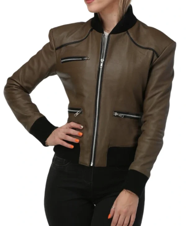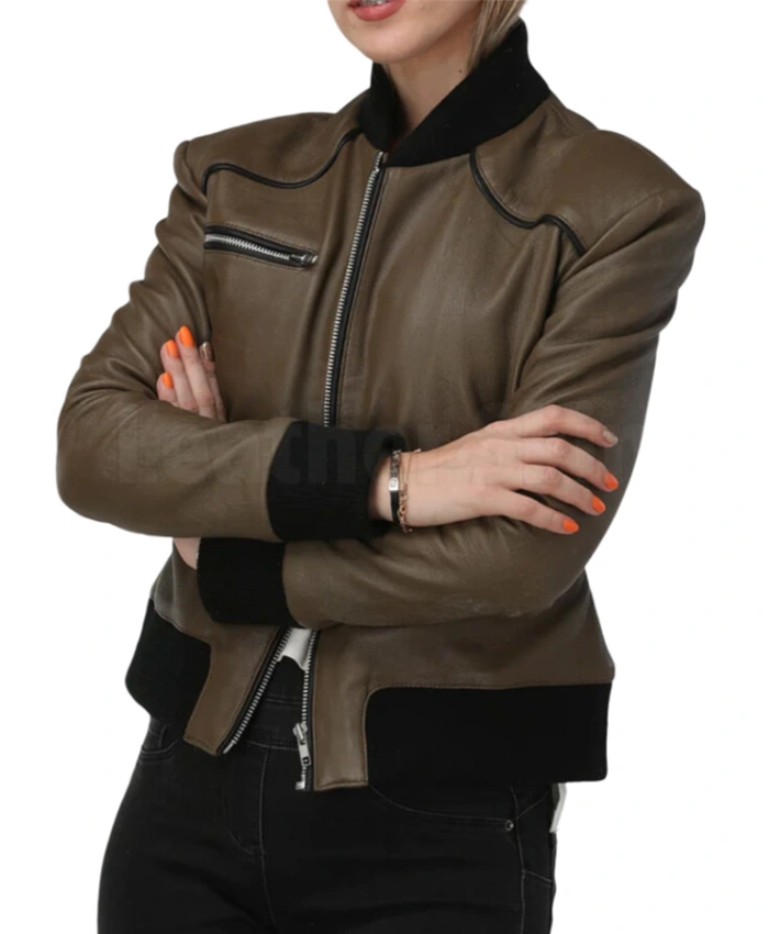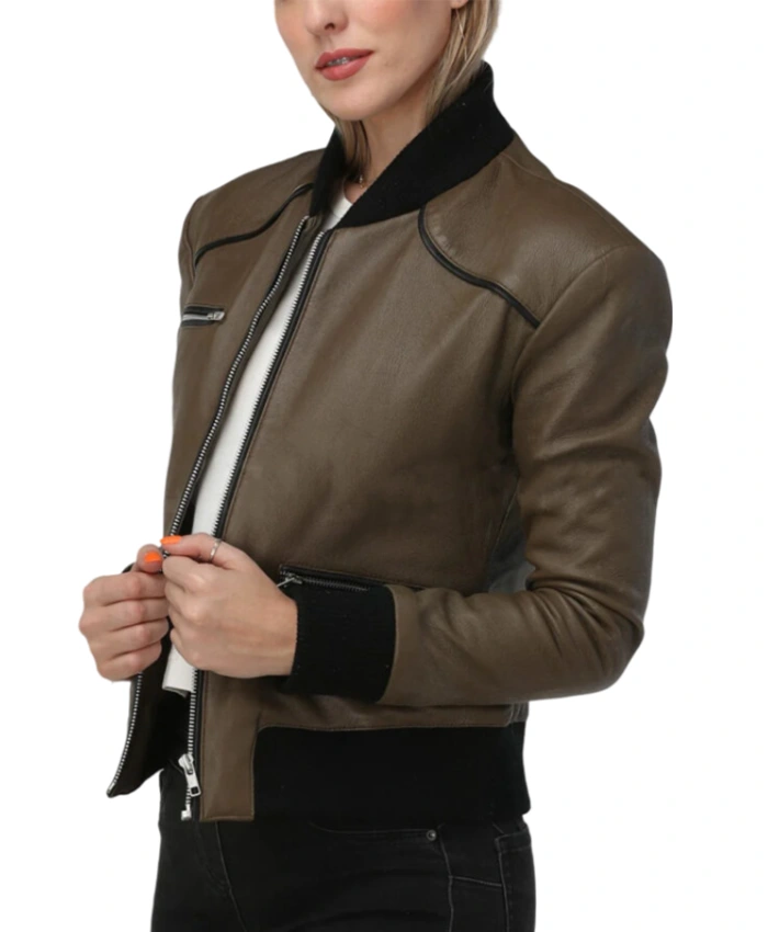 Brown Women’s Leather Bomber Jacket With Rib Collar